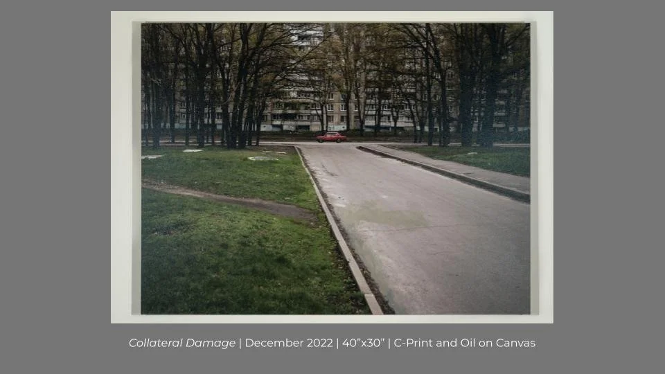 I created Collateral Damage by first printing, then painting over a photo by AP photojournalist Felipe Dana captured on April 19, 2022. Dana’s photo showed the body of a man with white hair killed during a Russian bombardment of a residential neighborhood in Kharkiv, Ukraine. The man lies facedown in the street with his arms pinned under him. A trail of his blood fills the gutter.